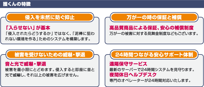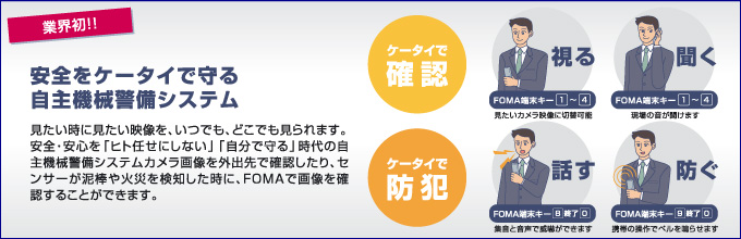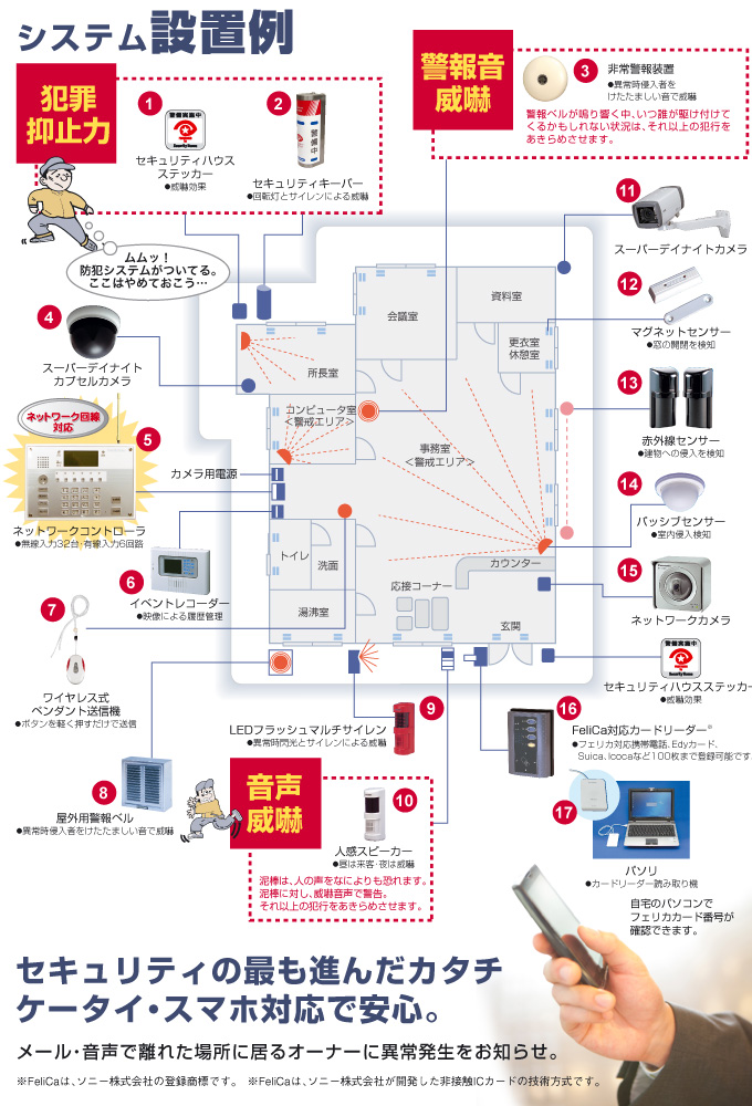 | 2.インターネットの環境があれば、パソコンからでも携帯からでも確認がとれるので、即警察へ通報 威嚇と到着時間の予測ができないため、犯行を未然に防ぐ。 |