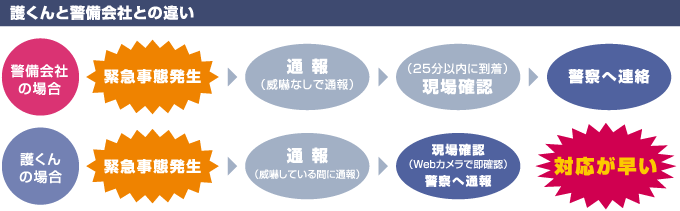 | 1. 異常を検知したら、音を鳴らさずに警備会社へ通報 周りにも気づかれず、警備員の到着時間を予測しやすい。 |