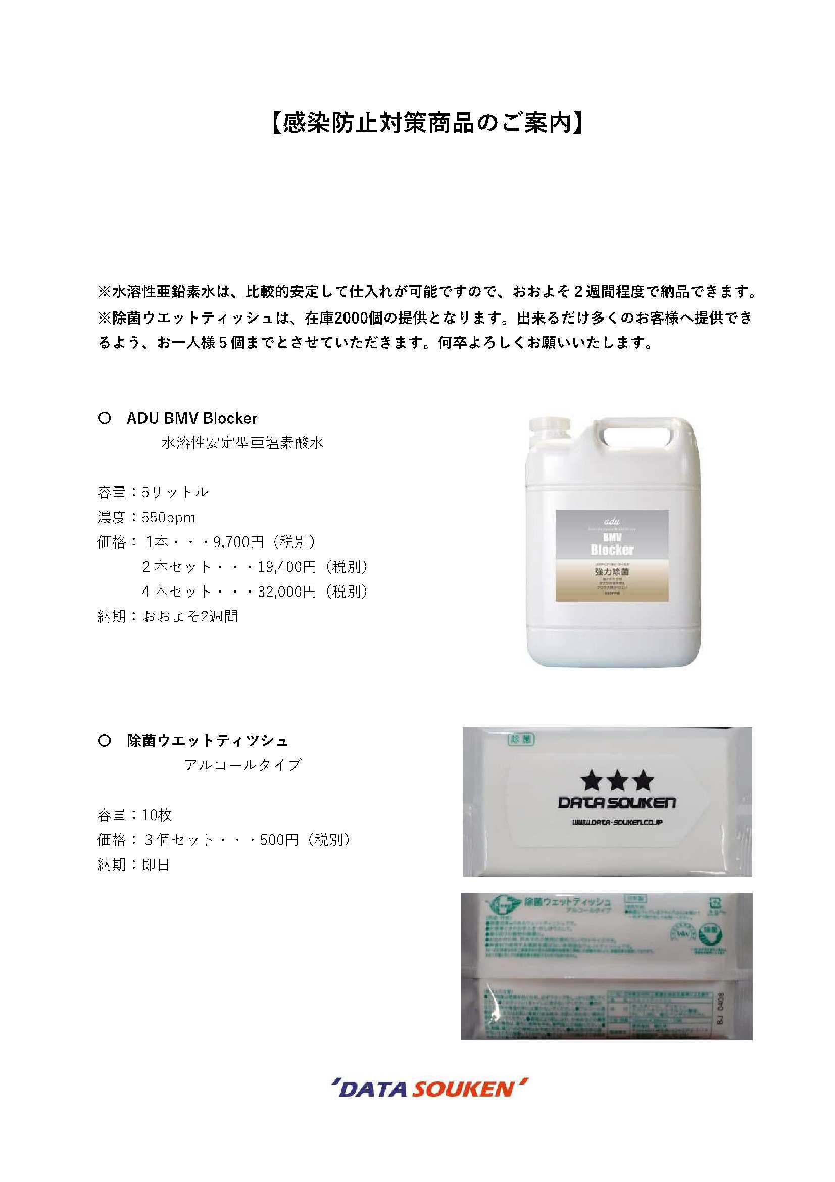 日頃からお世話になっているお客様に対し、なにか感染防止対策商品の提供が出来ないものかと、模索しておりました。ここへきて、納期は多少不安定でありますが、「亜塩素酸消毒液」と「除菌アルコールティッシュ」をご提供できるようになりました。微力ではありますが、お困りのお客様がおりましたら、担当営業へお問い合わせください。