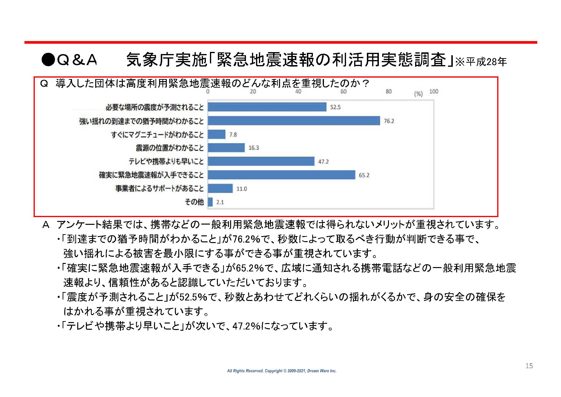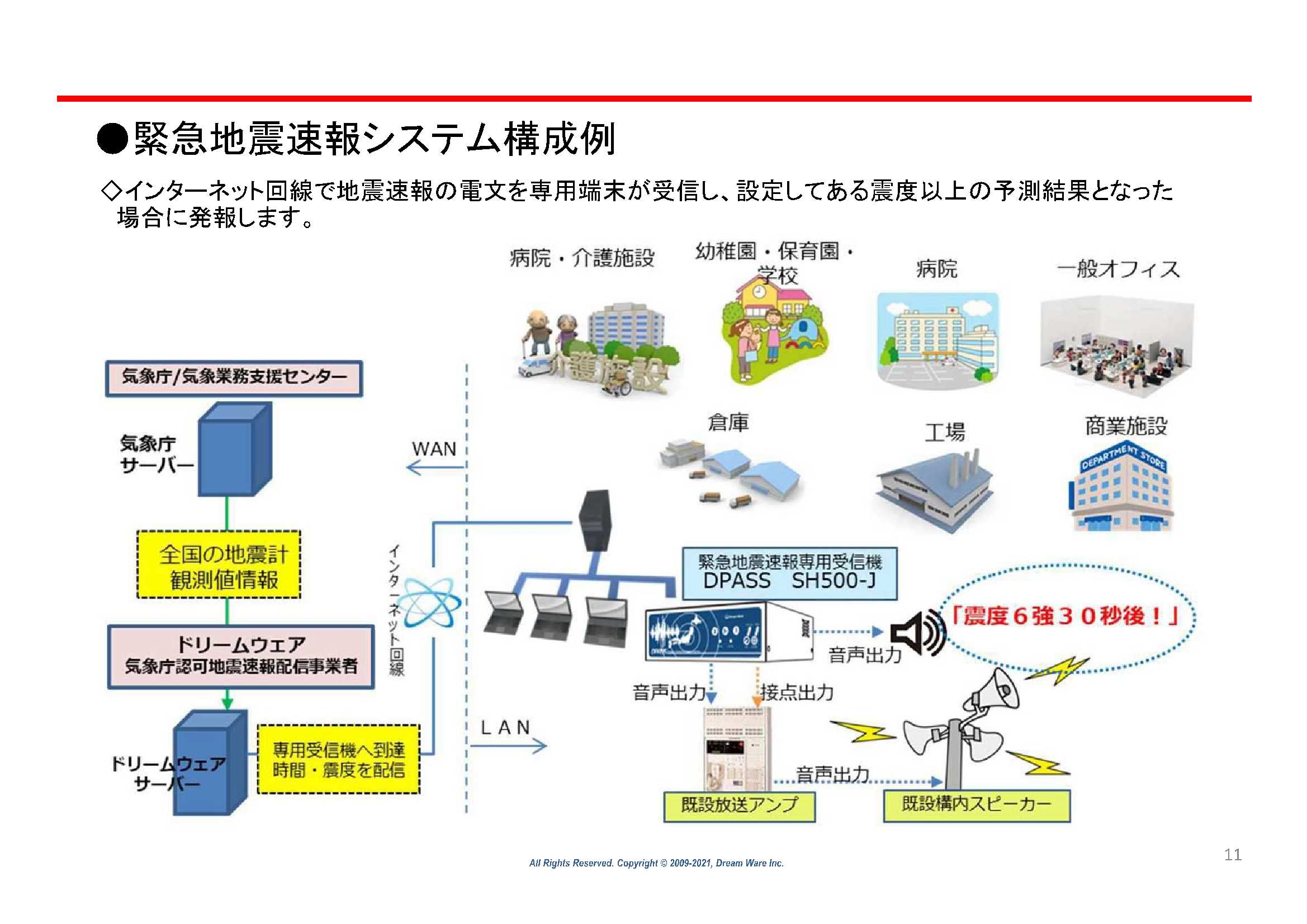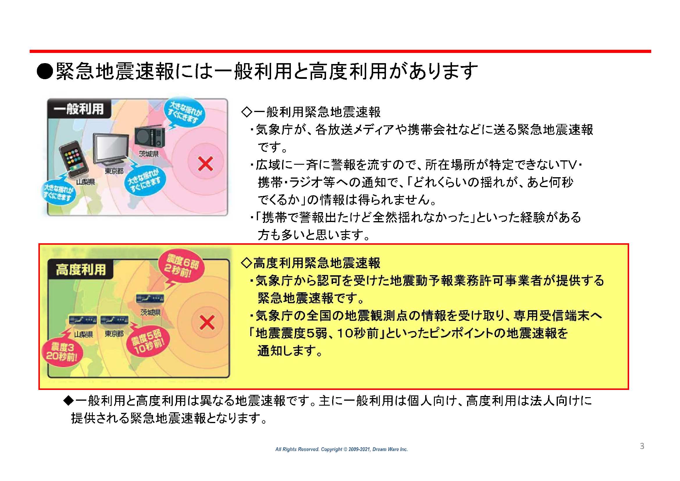 『高度利用 緊急地震速報』は、気象庁の統計でスマホ等の一般的な緊急地震速報より《約7秒》早く警報が発砲されます。地震の際の人的被害は、秒単位で大きく変わるといわれています。当り前のように起きる自然災害から社員を守るため自社に導入しました。月々わずかな費用でレンタル出来ます。もう少し詳しく知りたいという場合は、担当営業までお問い合わせください。